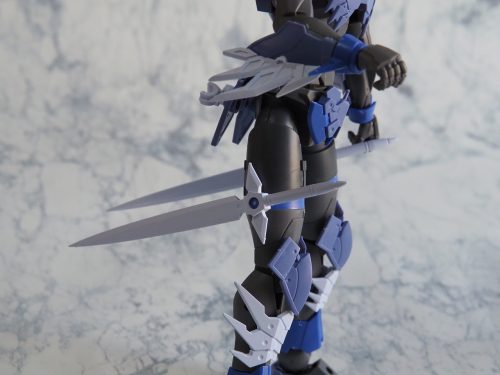 2本のデュアルブレードは足にマウントする事も出来る。リネージュのダークエルフを目指すならこのように装備するのも良さそうだ。本格的にリネージュに寄せるなら、剣を黒く塗装してDnDB(ダークネス・デュアルブレード)にしてみるのも面白そう。