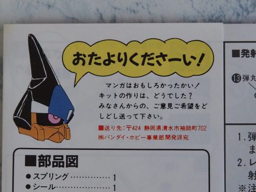 初販と再販を見分ける簡単な方法が、説明書に書かれた「おたよりくださいーい!」。ホビー事業部は現在は静岡市に移転しているので、お便りを送られても困るので、「おたよりくださいーい!」は削除されている。