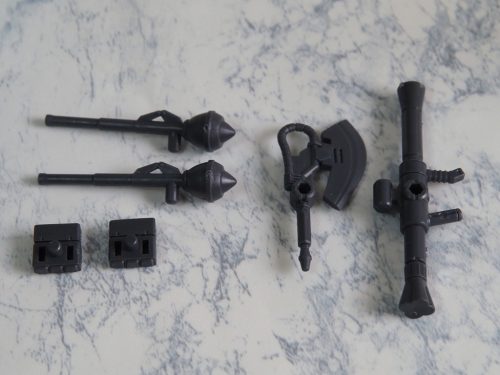 シャア専用ザクの武器セットは豊富で、ザクバズーカ、ヒートホーク、シュツルムファウスト、3連装ミサイルポッドが付属。